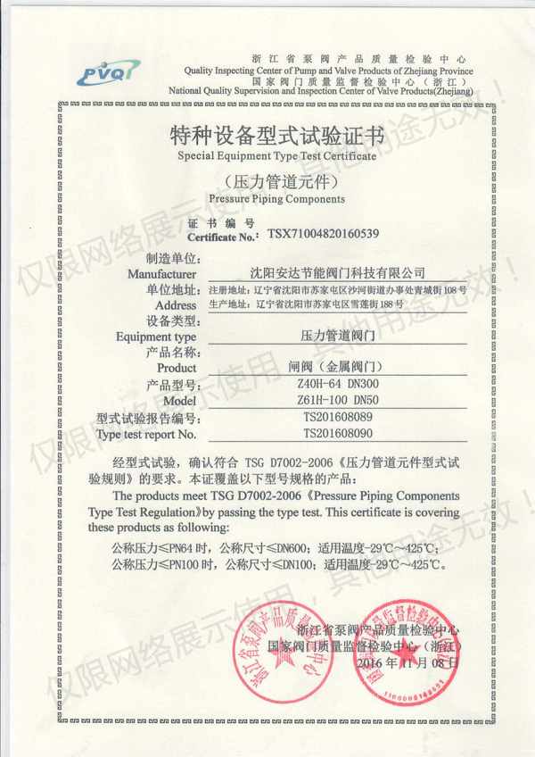 安達(dá)閥門特種設(shè)備實(shí)驗(yàn)證書